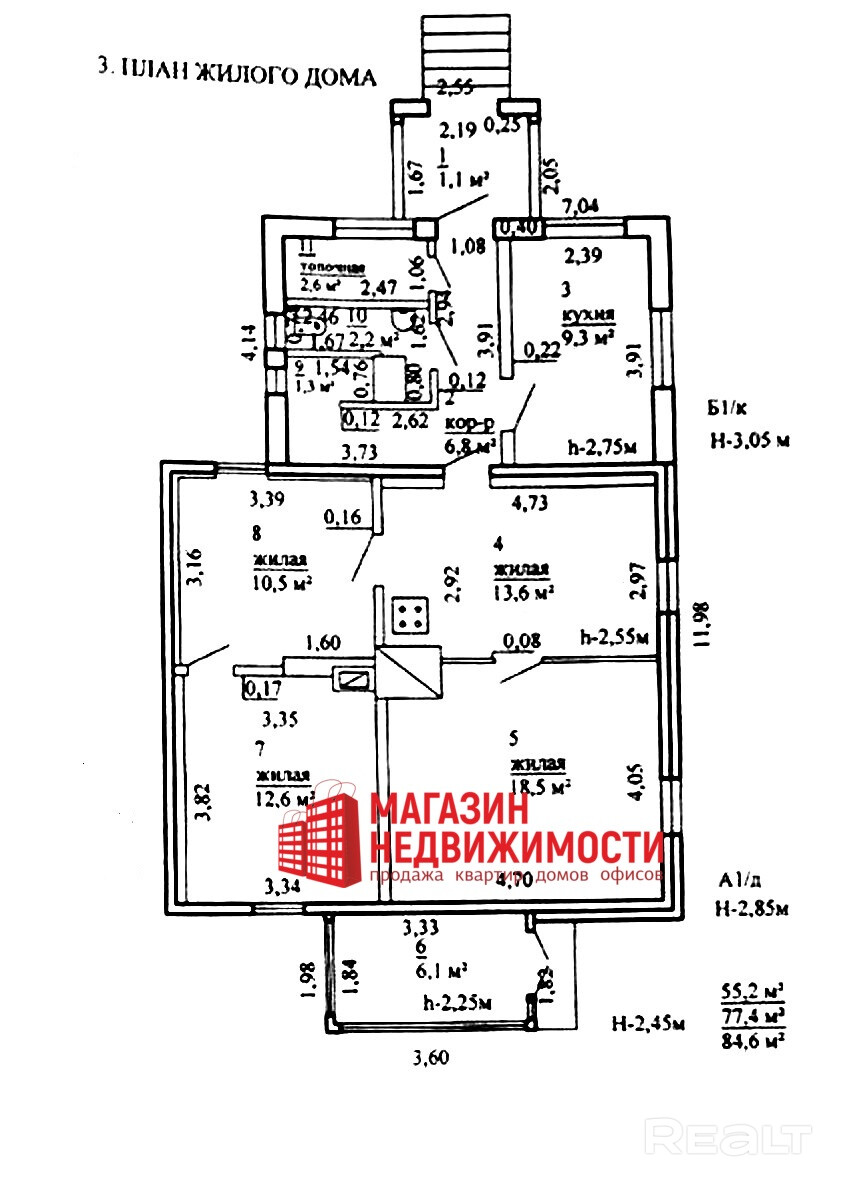 Общая информация: общая площадь – 84,6 м2, жилая – 55,2 м2, кухня – 9,3 м2. Дом 1924 г.п., расположен на участке 25 соток. Количество комнат – 4.