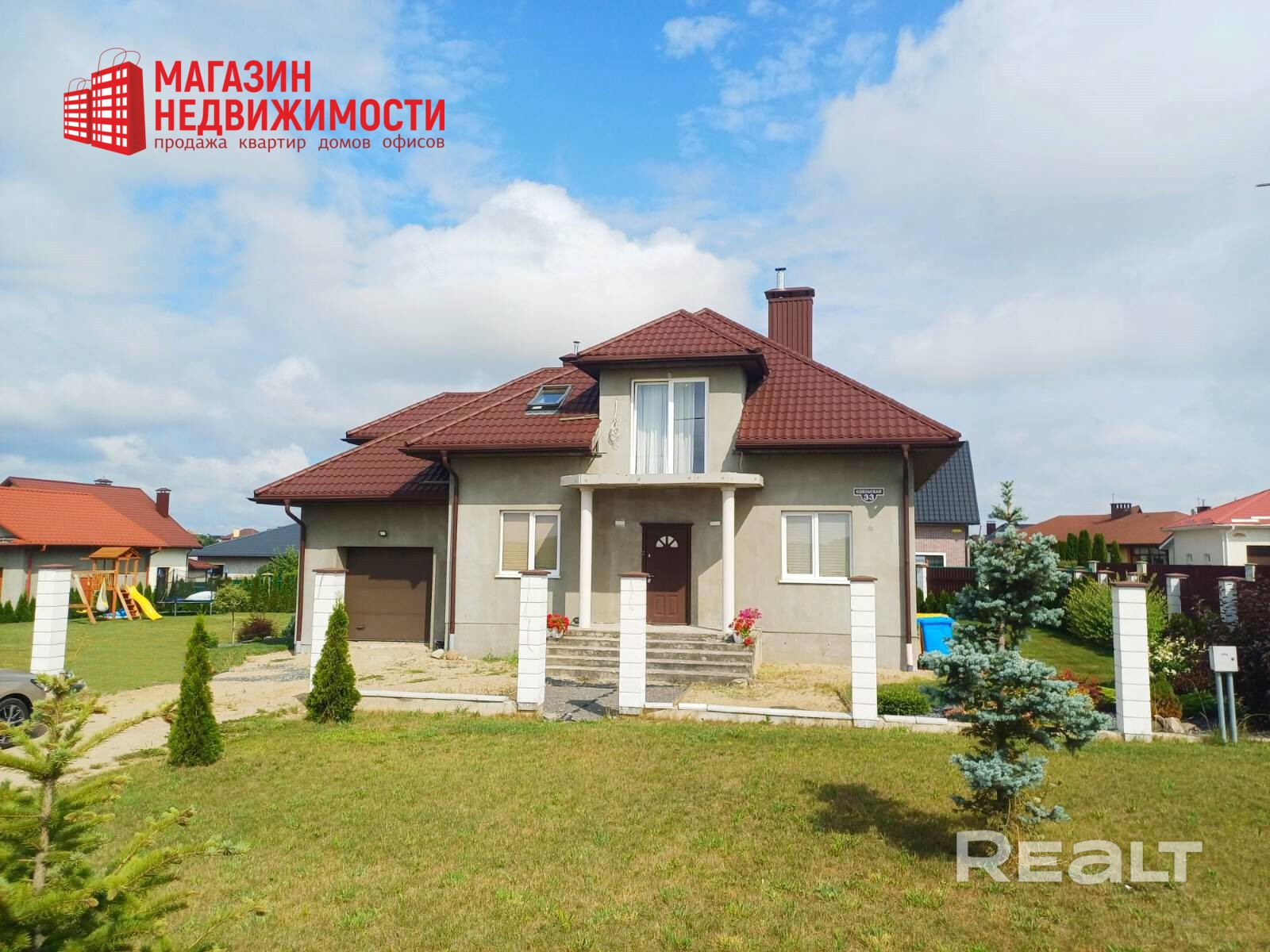 Участок огорожен по всему периметру . На участке расположены: декоративные зеленые насаждения, цветники, газон, детская игровая площадка, лаунж зона (зона отдыха).