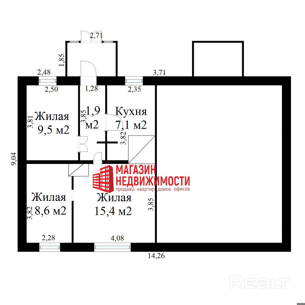 Характеристики квартиры: общая площадь — 46 кв.м, жилая – 33,5 кв.м, кухни – 7,1 кв. м, высота потолка 2,65 м. Окна и входная дверь – стеклопакеты ПВХ. Коммуникации: электричество и газ. Колодец глубиной 10 м — ½ доля. В доме печное отопление. Уборная на улице.