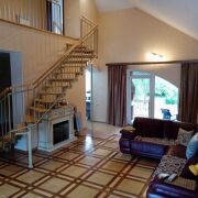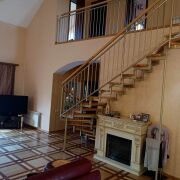 На первом этаже расположены: гостиная со вторым светом, кухня площадью 14,3 м2 со встроенной техникой (варочная панель, духовой шкаф, посудомоечная машина), спальня, постирочная с окном, сан узел с душевой кабиной. В прихожей и тамбуре установлены вместительные гардеробные системы фирмы Komandor. Лестница на второй этаж на металло-каркасе, ступени и перила из массива дуба. На втором этаже три просторные спальни, кладовая с пунктом управления контурами теплых полов, в ванной комнате установлены джакузи, раковина, унитаз и биде.