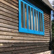 Уютный деревянный дом , окружён зелёным металлическим забором.