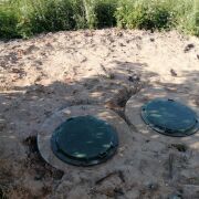 Большой огороженный участок, на котором есть 2 вместительных погреба и несколько сараев.