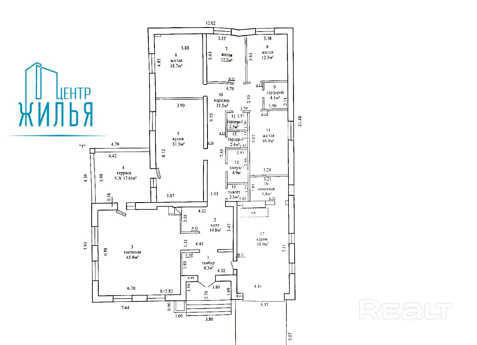 Современная функциональная планировка – 4 спальни, просторная гостиная (46 м2), большая изолированная кухня (32 м2), 3 гардеробные комнаты, 2 санузла, гараж с электрическими воротами (31 м2), терраса (18 м2). Высокие потолки – 3,12 м. Много пространства и естественного освещения. Планировка позволяет реализовать всевозможные варианты ремонта.