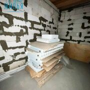 Первый этаж оштукатурен, залита чистовая стяжка. Мансардный этаж утеплен, обшит гипсокартоном, на полу уложена ОСБ-плита.