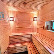 Общая площадь бани составляет 49 м2. Напольное покрытие – керамическая плитка, стены обшиты вагонкой из сосны. Оборудован санузел, душ, парная, комната отдыха.