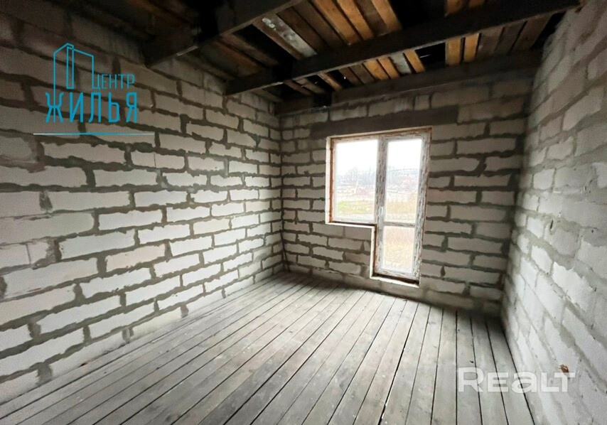 Стены выполнены из газосиликатных блоков толщиной 30 см., кровля – металлочерепица. Установлены окна ПВХ, межкомнатные перегородки – из силикатного кирпича, деревянные перекрытия, на полу лежит черновая доска.