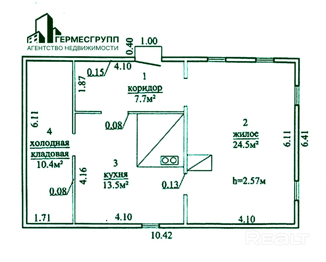 Общая площадь дома 56.1 м2, жилая площадь составляет 24.5 м2, площадь кухни – 13.5 м2.