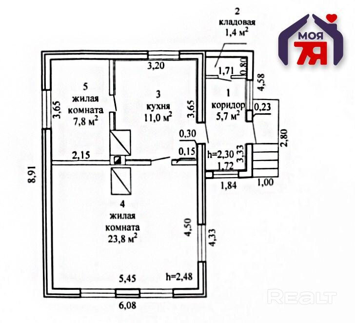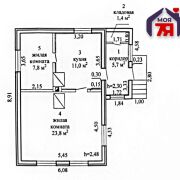 - Состоит из 1 жилого этажа: коридора 5,7 кв.м., кухни 11кв.м, две изолированные жилые комнаты 7,8 и 23,8 кв.м.