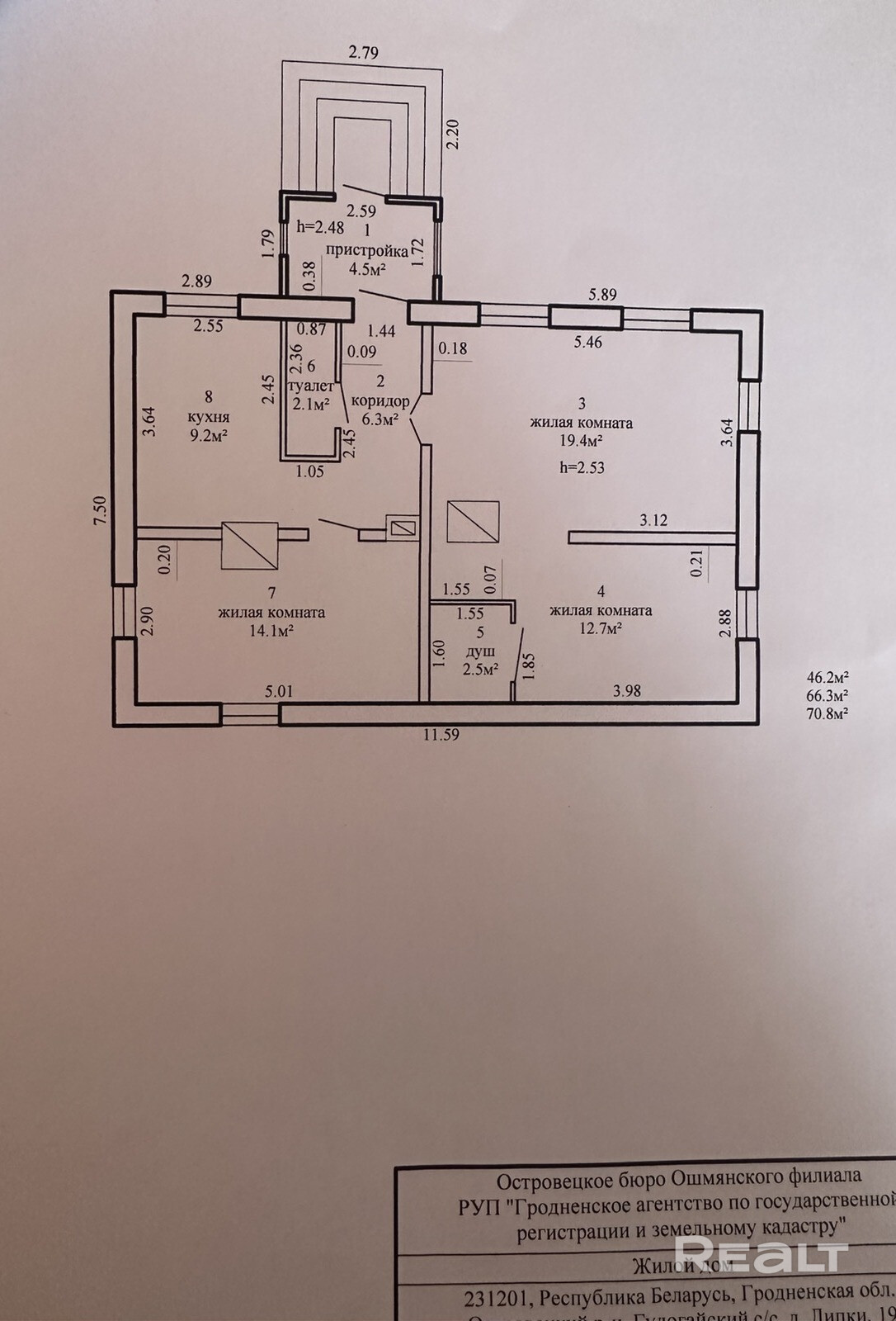 - Общая площадь составляет 66.3 м2, жилая - 46.2 м2, кухня - 9.2 м2.
