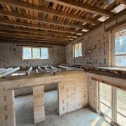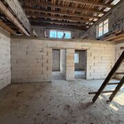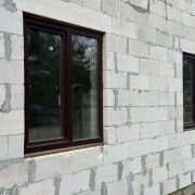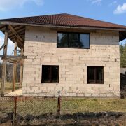 Дом двухуровневый, материал стен - блок газосиликатный, фундамент - ленточный (1,20м), окна - ПВХ ламинированный, кровля - андулин.