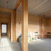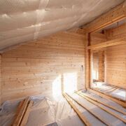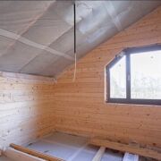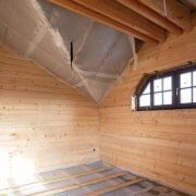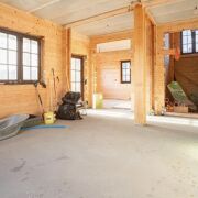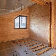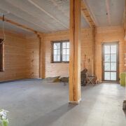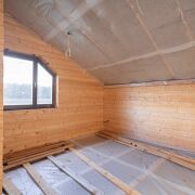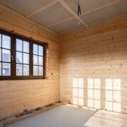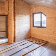 Стены дома обшиты деревом, а на полу - бетонная стяжка, покрытие пола вы можете выбрать на свой вкус.