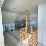 Планировка на первом этаже дома: большой холл с деревянной лестницей на мансардный этаж, две комнаты, просторная кухня, раздельный санузел, прихожая, гардеробная.). Высота потолков -2,7м