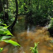 К участку примыкает березовая роща, живой ручей, весь на родниках, втекающий в реку Ошмянку. На пересечении ручья и реки чудесное живописное место.