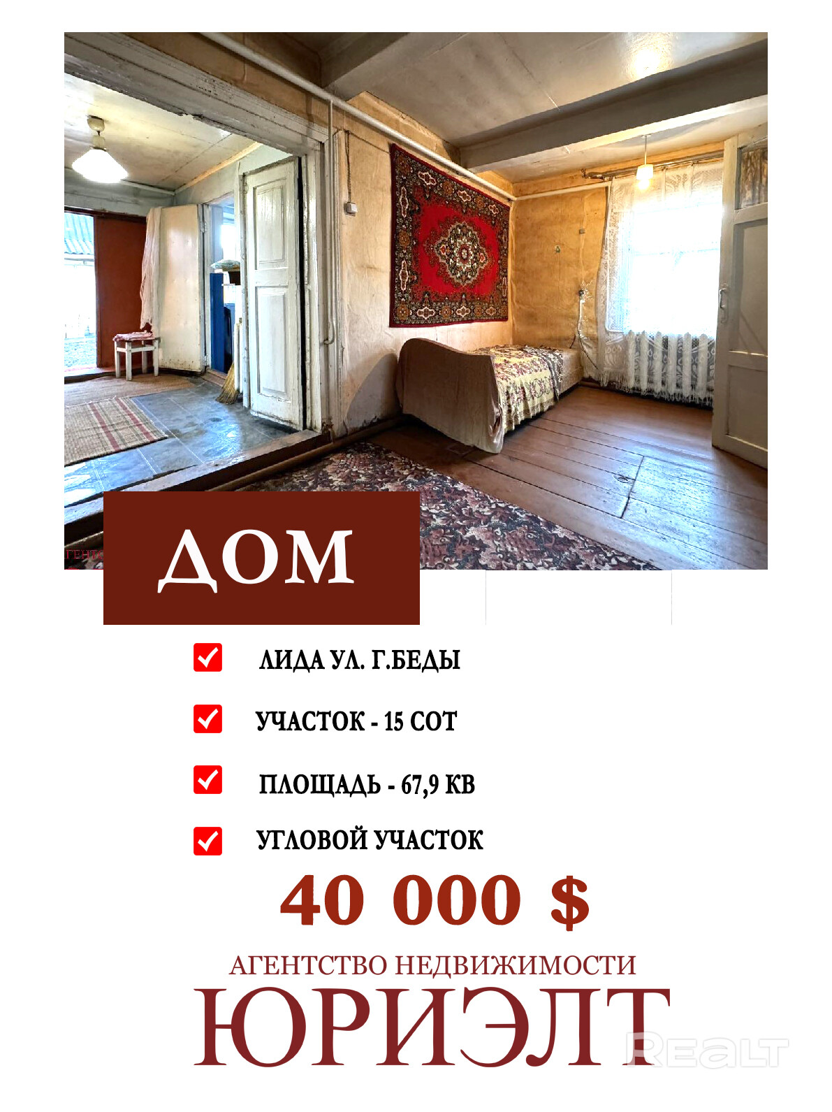 Продается угловой участок с одноэтажным деревянным дом, обложенным кирпичом. У дома два участка 15 и 17 соток в аренде. На 15 сотках стоит дом, 17 соток дополнительно для ведения личного приусадебного хозяйства. К дому подведены все коммуникации; водоснабжение - центральное, электроснабжение - центральное, газоснабжение – центральное, канализация автономная. Дом требует ремонта. Имеется большой подвал. Территория огорожена. Хозпостройки - гараж, два сарая.