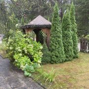Полностью обустроенная кухня, газовая плита (газовый баллон). Имеется душевая кабина. Вода - скважина, канализация - местная. На участке установлена беседка, имеется уличный туалет. Красивое, живописное место, за забором сразу лес.