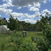 На участке имеются плодовые деревья и кусты, туи. Участок ровный, по периметру огорожен металлической сеткой . Есть блочная хозпостройка ,душевая кабина и теплица.