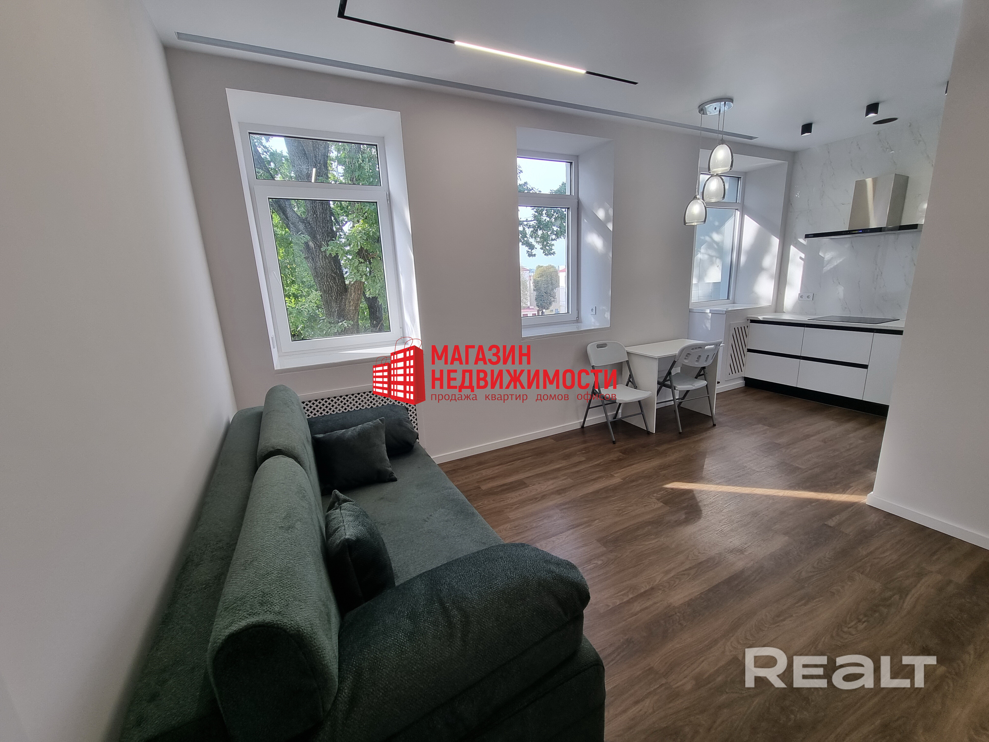 Окна квартиры выходят в красивый зеленый двор. Из них открывается вид на Фарный костел, исторические здания улиц Советской и Калючинской, красивую новую застройку с чертами утраченных зданий 21 и 23 ул. Калючинской. Пешеходная зона начинается от подъезда дома.