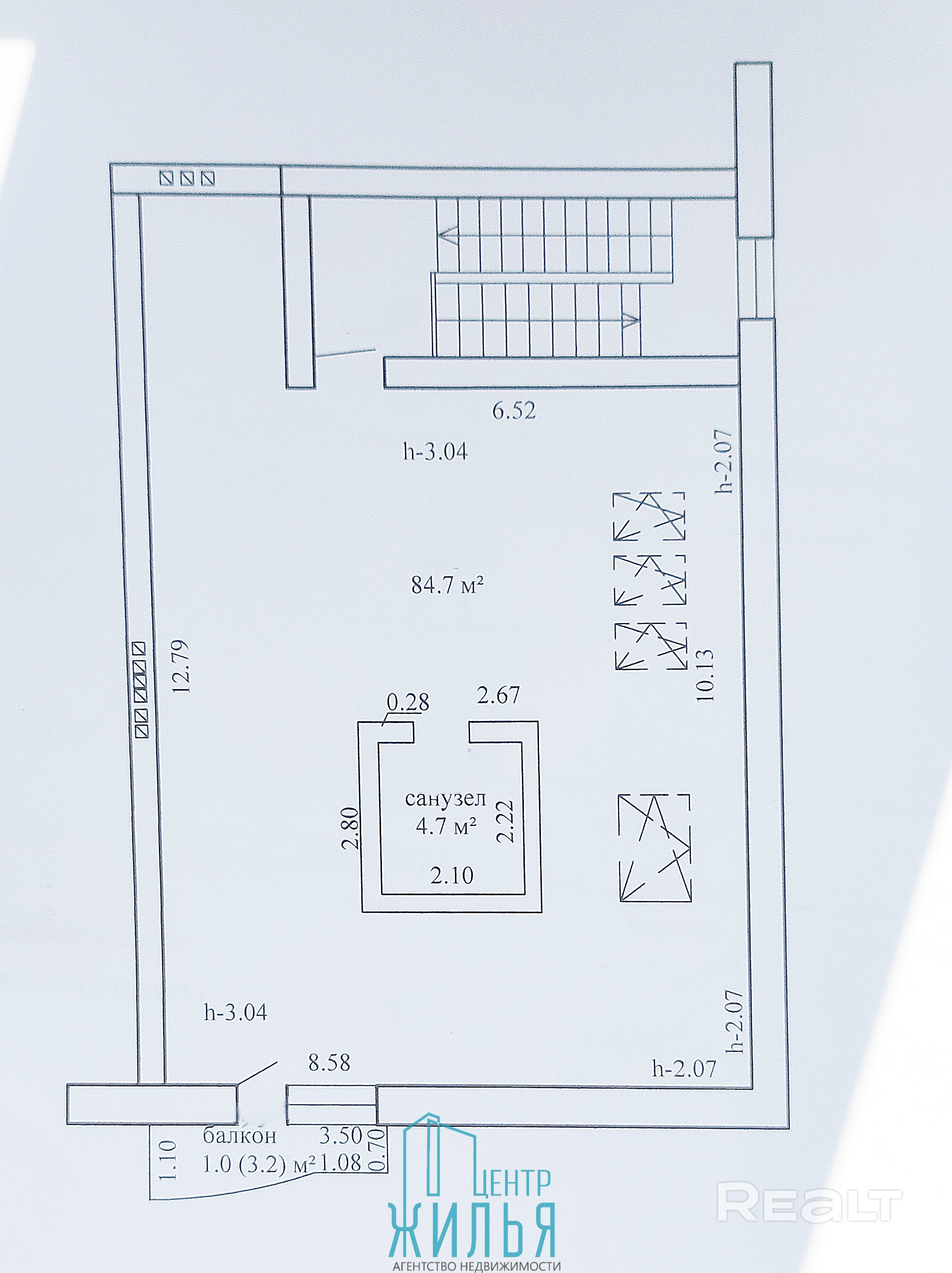 Общая площадь по СНБ 90,4 м.кв. Планировка свободная – предусматривает размещение 3-,2- или 1-комнатной квартиры.