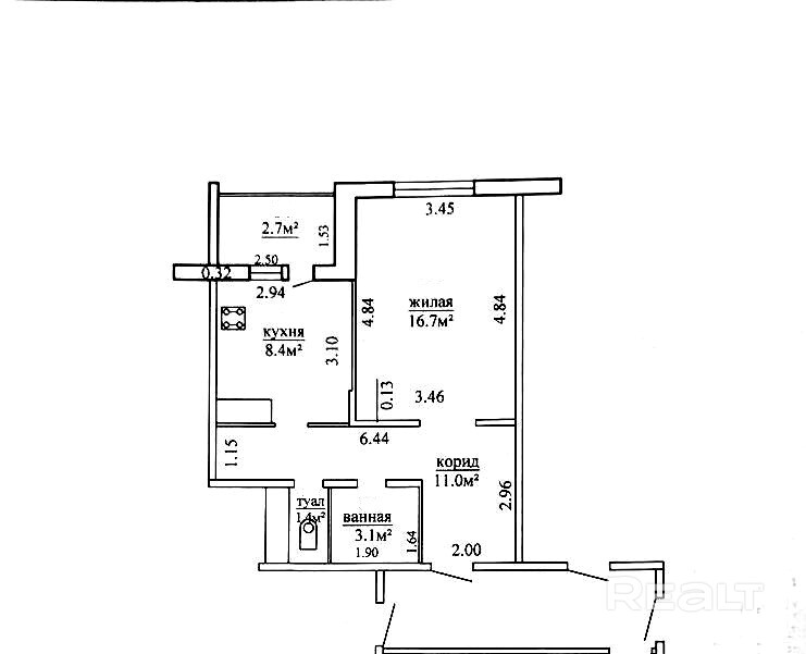Параметры квартиры: общая площадь- 43,3 кв м по СНБ , жилая площадь- 16,7 кв м, кухня-8,4 кв м.