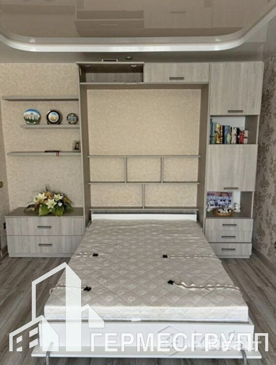 Квартира продается с мебелью: в зале встроенная двуспальная кровать.