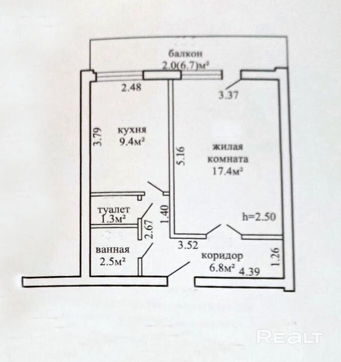 Общая площадь – 37,4 кв. м., жилая – 17,2 кв. м., кухня – 9,4 кв. м.