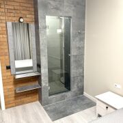 В спальне оборудована собственная душевая кабина, есть отдельная гардеробная с продуманной системой хранения. Санузел и ванная комната облицованы качественной плиткой, установлена современная сантехника и вместительная стиральная машина. Входная дверь оборудована электронным замком ― безопасность на высшем уровне.