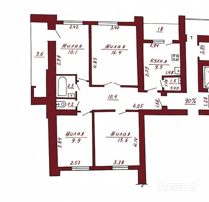 В продаже четырехкомнатная квартира по ул. Горького, 88, 1976 года постройки. Площадь по СНБ 80.5 кв.м., общая 75.1. кв.м., жилая 50. кв.м, кухня 9.5 кв..м. Две застекленные лоджии. Внутренние стены - кирпич.