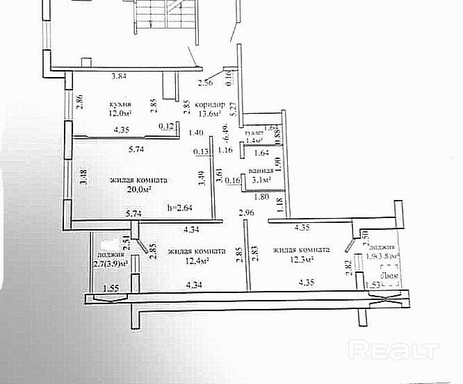 в кухне 12 м2 организовать спальню, а в гостиной 20м2 -кухню-гостиную. Коридор 13,6 м2, санузел раздельный. За квартирой закреплена подвальная ячейка.