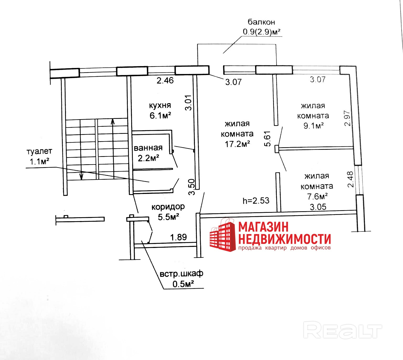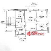 Технические характеристики: площадь квартиры по СНБ – 50,2 кв.м, общая — 33,9 кв.м., комнаты — 17,2 кв.м., 9,1 кв.м. и 7,6 кв.м., кухня — 6,1 кв.м.