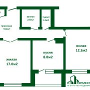 Общая площадь 52,3 м2, жилая 29,3 м2, кухня 8,8 м2.