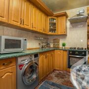 - Укомплектованная кухня площадью 8,6 кв.м: газовая варочная панель и электрический духовой шкаф.
