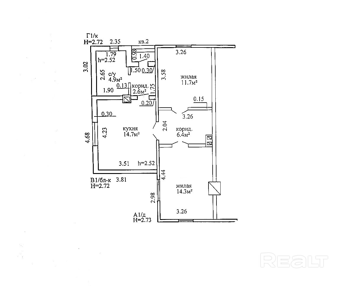 Общая площадь квартиры 54.6 кв м, жилая 26 кв м., кухня 14 .7кв.м,