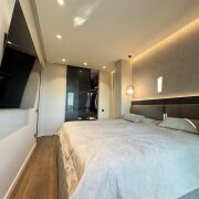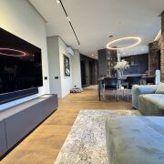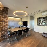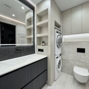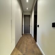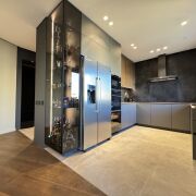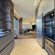 Ремонт выполнен согласно дизайн-проекта исключительно из материалов премиум класса. Встроенная мебель во всей квартире изготовлена на заказ из высококачественных материалов по индивидуальным эскизам. Кухня со встроенной техникой немецких производителей европейской сборки.