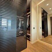 В квартире 3 встроенных больших шкафа с подсветкой внутри и вместительная гардеробная.