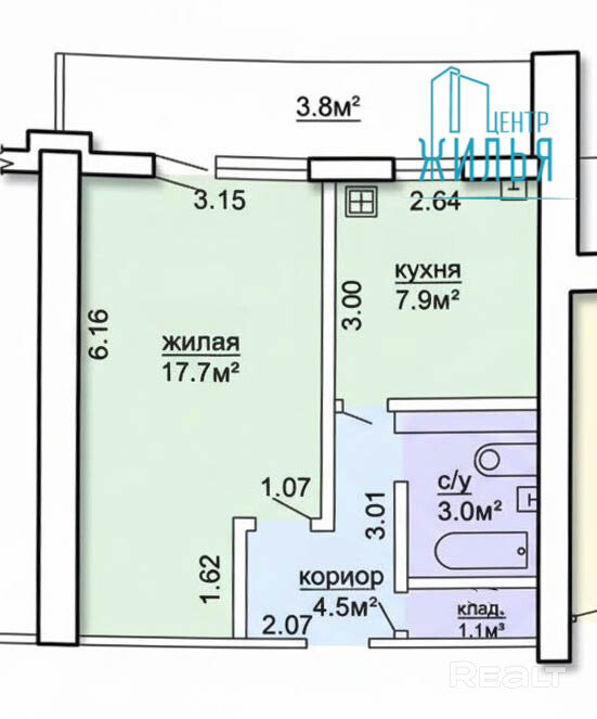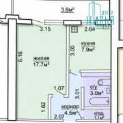 Общая площадь квартиры составляет 34,2 кв.м. (площадь по СНБ – 38,0 кв.м.), в т.ч.: жилая – 17,7 кв.м. и кухня – 7,9 кв.м.