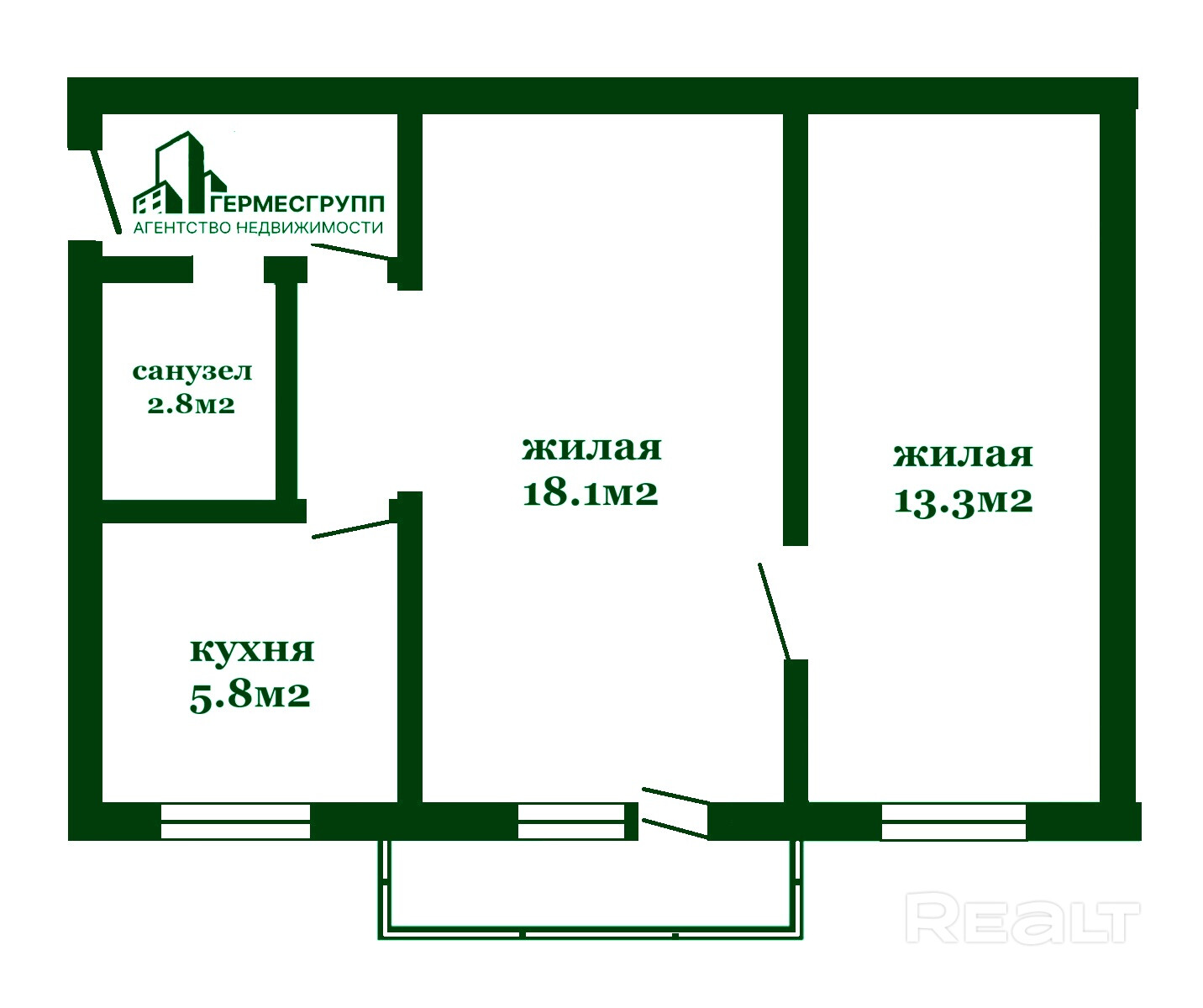 · Площадь: общая — 43 м2, жилая — 31.4 м2.