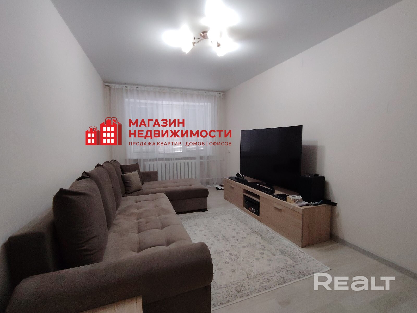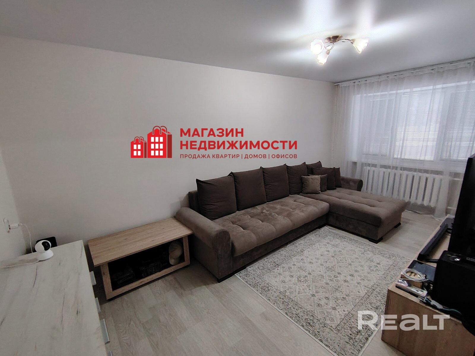 · Просторный зал. Светлое помещение с большим окном, выходящим на оживленную городскую улицу:Новый замок. Идеальное пространство для отдыха и приема гостей.