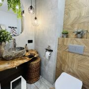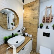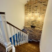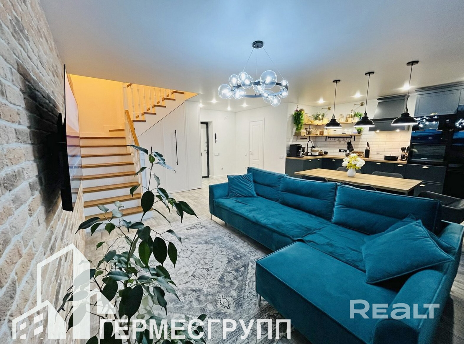 Красивая деревянная лестница из натурального дерева и стены с декоративным камнем создают неповторимую атмосферу уюта. Теплые полы обеспечивают тепло и комфорт в любое время года.