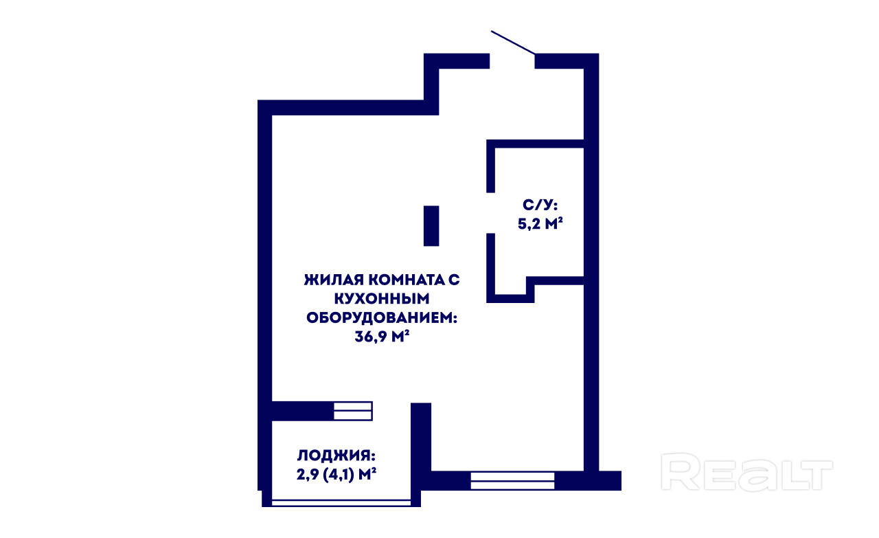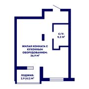 Квартира в доме 2023 года постройки с закрытым двором общей площадью 45.0 кв. м. с жилой комнатой с кухонным оборудованием 36.9 кв. м