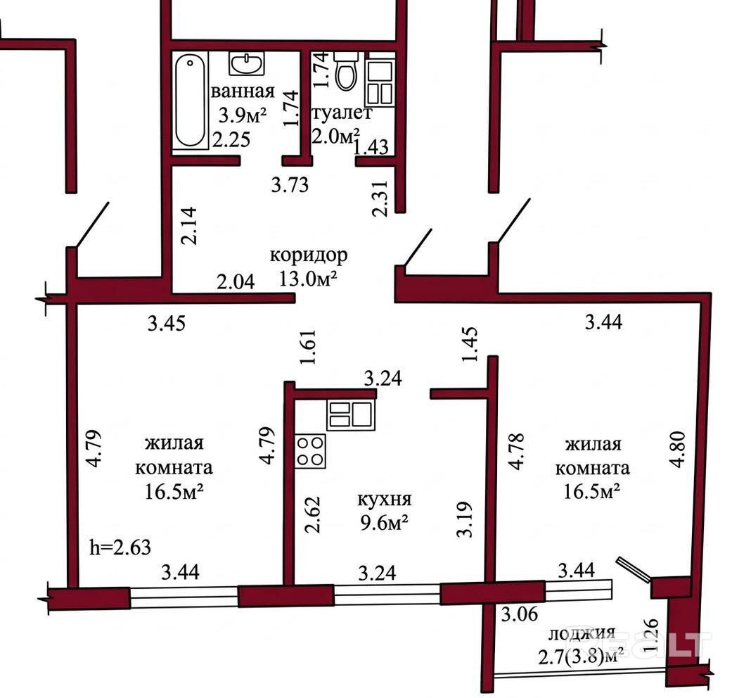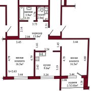 Общая площадь квартиры по СНБ – 64,2 кв.м., общая площадь – 61,5 кв.м., жилая площадь – 33,0 кв.м., кухня – 9,6 кв.м.