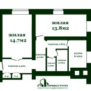 Общая площадь 50.3 м2, площадь жилых помещений 28.5 м2, кухня 6 м2, установлены приборы учёта воды и газа.
