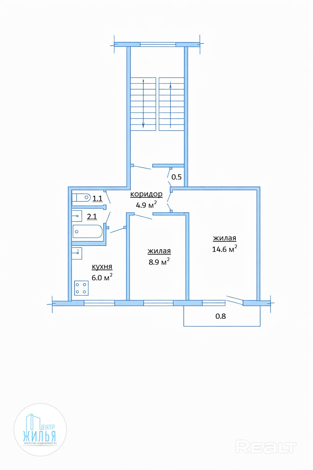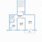 Общая площадь квартиры по СНБ — 38.9 м.кв., жилая — 23.5 м.кв., кухня- 6.0 метров.