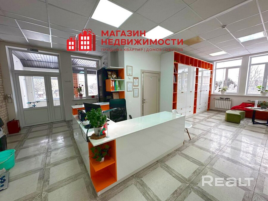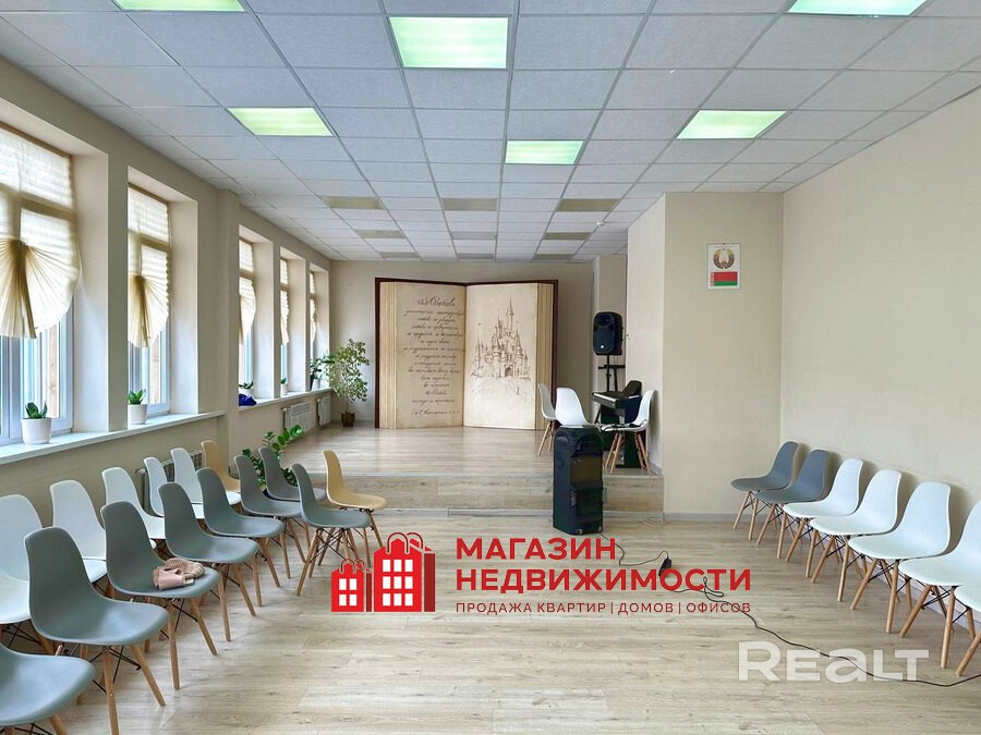 Коммуникации: наличие инженерных систем: электричество на 220В и 380В, котельная своя: 2 газовых котла и 2 резервных электрических, полностью новые коммуникации и внутри и снаружи: электричество, канализация (труба канализации диаметр 100 мм), вода, батареи отопление, газ. Санузлы и душевые. Новая крыша, зона высадки, вся территория в тротуарной плитке, электрические ворота, в каждой комнате (кабинете) есть вода и канализация, новые окна, пожарная сигнализация по всему зданию, скоростной интернет в каждой комнате, серверная, большая территория и возможность дополнительно построить здания. Вентиляция с естественным побуждением в обоих зданиях. В каждом кабинете пожарная и охранная сигнализация. Видеонаблюдение по периметру территории. Белтелеком 5-6 камер.