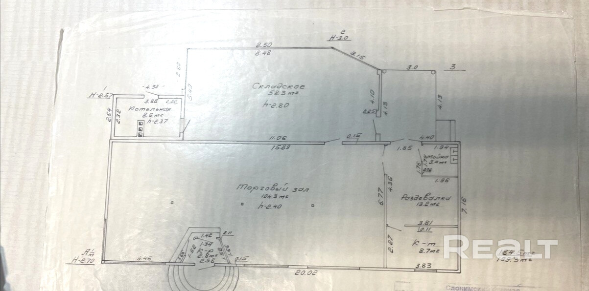 Площадь: 199.3м кв. представляет собой просторный зал и дополнительные помещения с возможностью установки холодильных камер или складов для хранения .