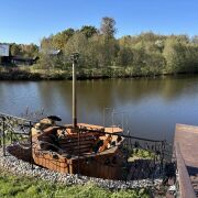 Выход к большому пруду с купелью из дерева.