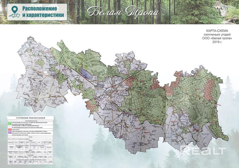 Территория состоит из 800 га закрытого вольера, где размещены десять домиков (окна пвх,кровать) на высоте 3м от земли для ведения охоты, также есть разделочный цех с морозильной камерой.