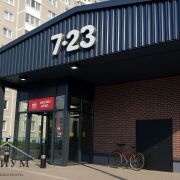 Здание расположено на западе города, в жилом микрорайоне с высотной застройкой, напротив рынка смешанного ассортимента. В непосредственной близости находятся магазины "Техно" и "Ома". Транспортная доступность высокая: рядом со входом расположена остановка общественного транспорта.