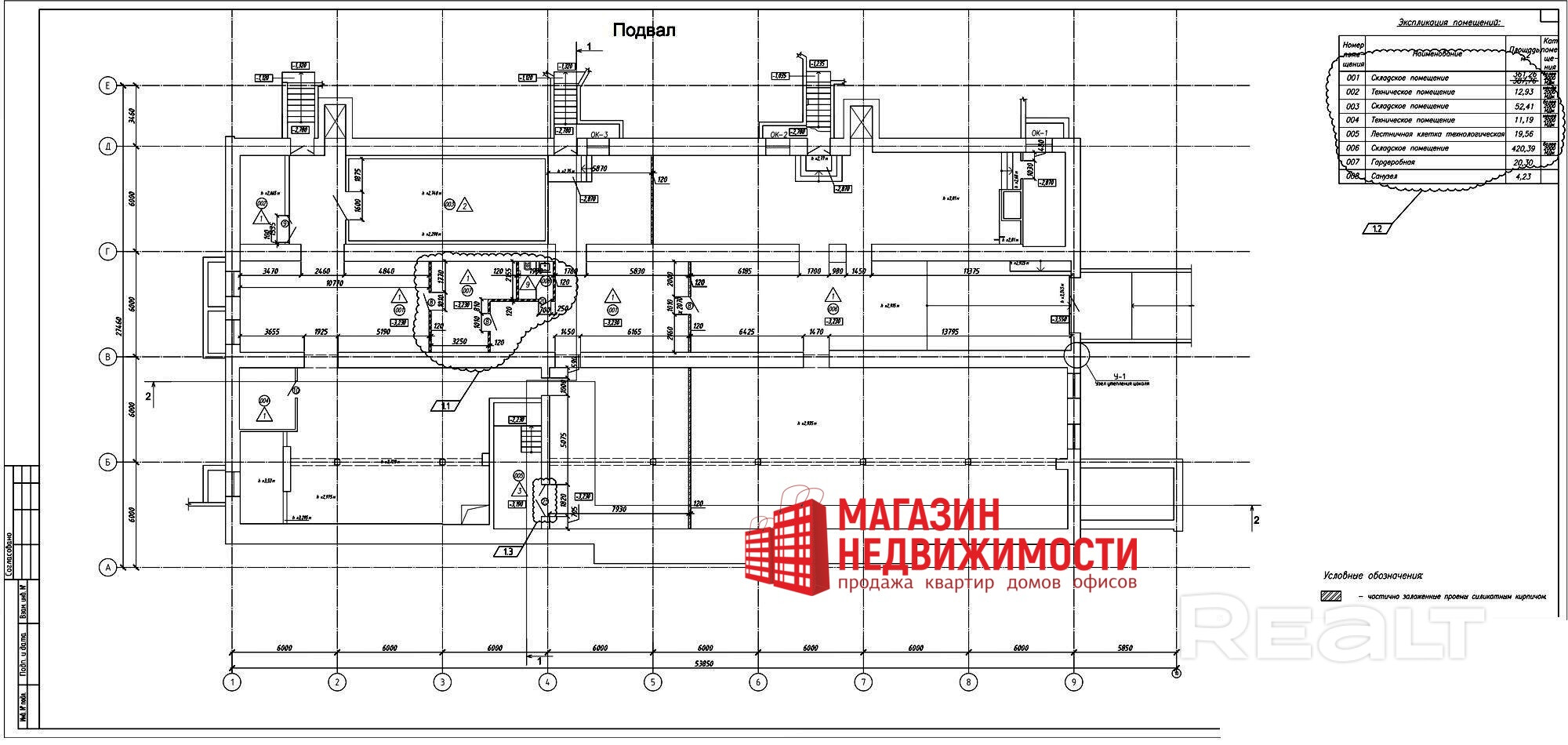 Фундамент – фундаментные блоки, наружные стены – кирпичные, перекрытия — железобетонные плиты, кровля — совмещенная рулонная, окна – стеклопакеты, полы: бетон, плитка. Высота потолков на 1 и 2 этаже – 3.00 м, в подвале – 2.91 м.