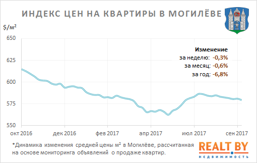 Средняя цена предложения в объявлениях о продаже квартир в Могилёве на минувшей неделе снизилась на 0,3% и составила 579 $/м2.