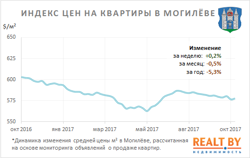 Средняя цена предложения в объявлениях о продаже квартир в Могилёве на минувшей неделе выросла на 0,2% и составила 578 $/м2.